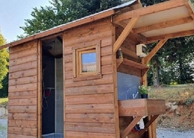 Emplacement spacieux 100 m2 environ arboré avec 1 bloc sanitaire individuel privé (1 douche de 120×80, 1 meuble SDB avec vasque et miroir, 1 WC et 1 évier extérieur inox pour la vaisselle). Il est délimité par des haies naturelles avec wifi, eau, électricité 10A ou 16A et évacuation.
